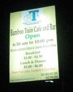 Our group returned to Battambang in time for a shower and change before dinner at the Bamboo Train Cafe and bar. We really enjoyed our evening meal here, the place has plenty of character and atmosphere, the meals all freshly prepared and delicious; the proprietor very congenial.